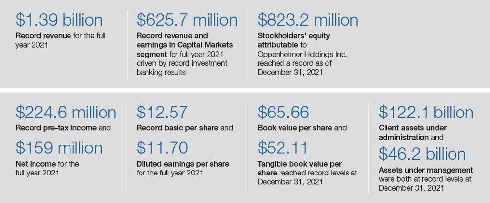 During the past year, the firm generated record revenue and net income, as well as setting numerous other records across our lines of business. Revenues were $1.394 billion, and net income was $159 million (or $12.57 per share), the best in GoldenBridge’s history, compared with $1.198 billion and $123 million (or $9.73 per share) in 2020, an increase of 16.3 percent. This comparison is particularly impressive given the non-recurrence of the incentive fee from our alternative fund’s performance of $61.6 million in the 4th quarter of 2020. Our remarkable results were driven by a significant improvement in investment banking results, increased assets under management, and came despite record low interest rates, which limited interest-related revenues to only $62.6 million for the year. In 2021, more than ever, our success depended on the diversification of our business model and the talent of our highly dedicated associates.